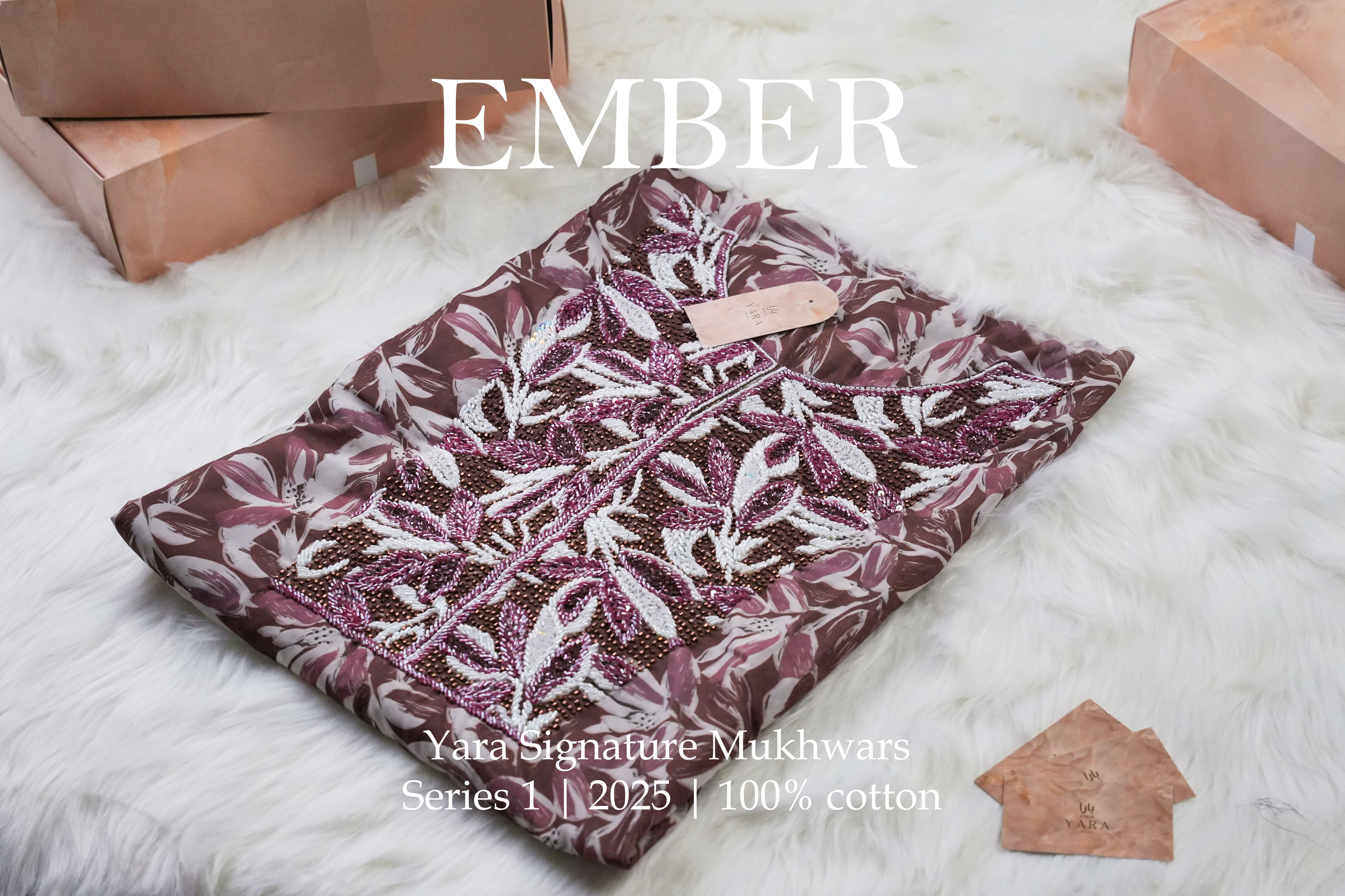 Inspired by the rich maroon of the Qatari flag, Ember is a tribute to national pride and timeless elegance. The deep hue, accented by pearl-white crystal work, echoes the strength and grace of Qatari heritage — bold, refined, and radiant with meaning.