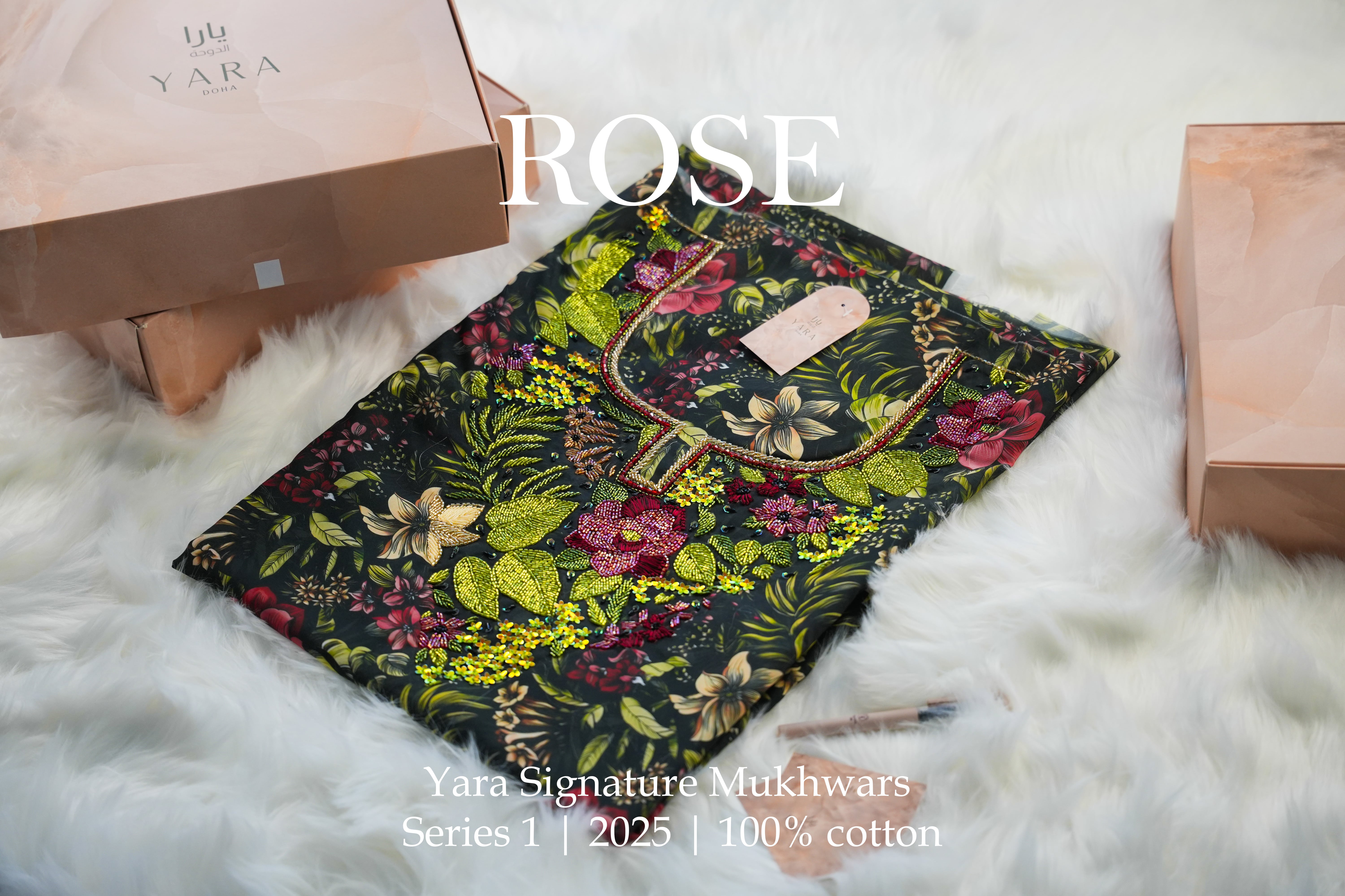 Dark and elegant, Rose is a mukhawar draped in black and adorned with delicate rose and soft floral patterns — a graceful nod to the traditional modesty and beauty cherished in Gulf femininity.