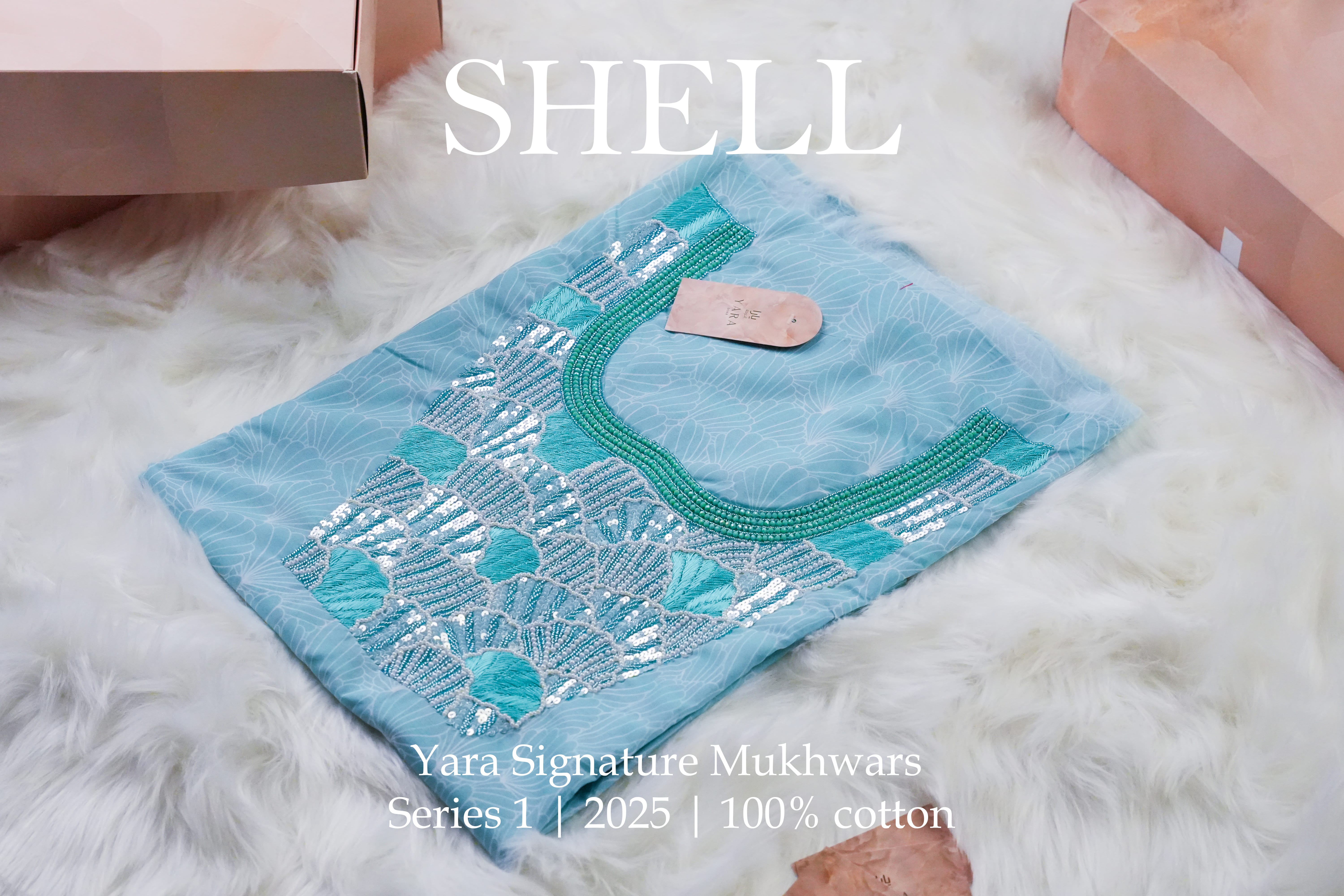 Inspired by the Gulf’s pearling legacy, Shell brings the sea to life with aqua tones and shell patterns. Pearls, crystals, and beads echo the treasures once gathered from Qatar’s waters.